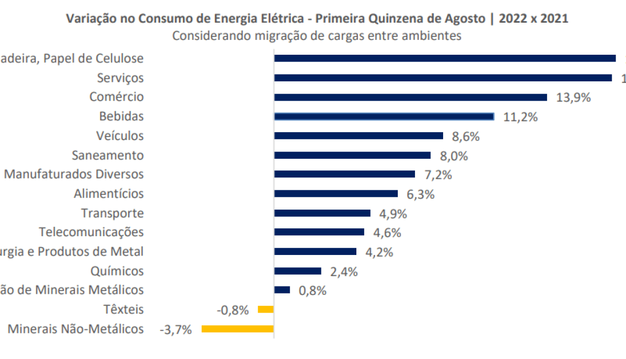 O Brasil consumiu 63.519 MW médios de energia elétrica nos primeiros quinze dias de agosto, alta de 3,3% em relação ao mesmo período de 2021, apontam os dados preliminares do Boletim InfoMercado Quinzenal da Câmara de Comercialização de Energia Elétrica (CCEE). O resultado reflete a retomada de alguns ramos de atividade econômica importantes para o país.